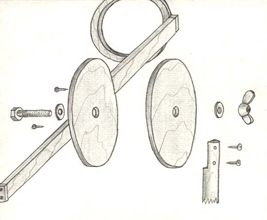 Узел осей ( см. рис.2 ) состоит из собственно осей - вертикальной и горизонтальной, планки с кольцами из фанеры для удержания трубы телескопа и импровизированного тормоза из двух фанерных кружков, который служит для фиксации трубы в нужном направлении. Вертикальная ось деревянная, точеная, подойдет тонкий черенок от садового инструмента, круглая ручка. Можно, конечно, применить и металлическую, например дюралевую трубку диаметром 20 - 25 мм. Горизонтальной осью будет служить болт М6 - М8, соединяющий обе половинки тормоза. Гайка-барашек служит для затягивания тормоза. Одна из половинок тормоза жестко крепится к вертикальной оси, другая соединена с планкой, к которой крепится труба. Труба фиксируется в фанерных кольцах деревянными клинышками, либо притягивается к планке хомутом. Труба балансируется относительно горизонтальной оси путем перемещения в удерживающих ее кольцах. Для надлежащей жесткости желательно собирать все деревянные части штатива на клею. Горизонтальная ось может передвигаться в отверстии основания вверх и вниз и фиксироваться в нужном направлении шплинтом. Это нужно для удобного расположения окулярного узла телескопа. Длина ножек штатива должна быть около 120 см, а длина вертикальной оси около 50 см. Чтобы ось сохраняла вертикальное положение и не имела большого люфта, необходимо увеличить толщину основания штатива дополнительными накладками из толстой фанеры. В каждом из кусочков фанеры можно выпилить или просверлить отверстие по диаметру оси, затем все это "нанизать" на ось и соединить на клею. В целом конструкция основания установки ясна из рис.3 .