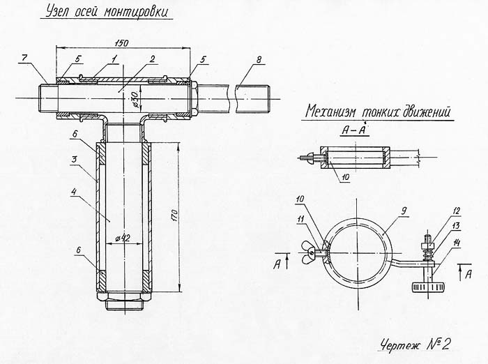 Установка телескопа первоначально была выполнена в "классическом" варианте: на стойке с тремя "лапами", с регулирующимися на высоте опорами на их концах. Диаметр стойки 60 мм, высота около 800 мм. Для узла осей мной был применен чугунный тройник диаметром 1,25 дюйма (32 мм). Диаметры осей составили: полярной 42 мм, оси склонений 30 мм (см. чертеж №2).