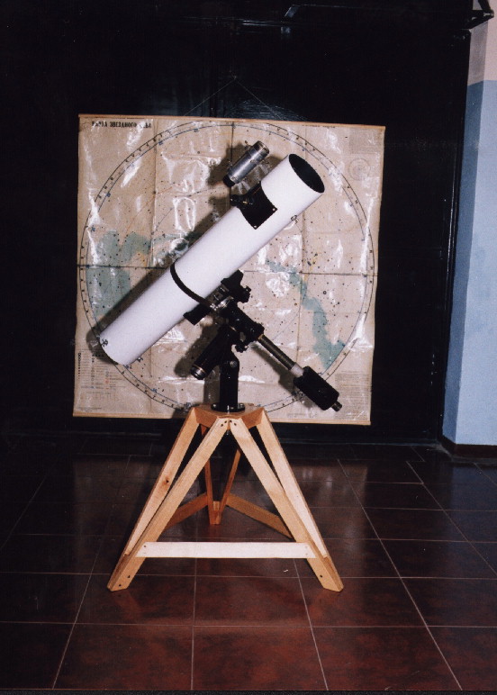 Испытания телескопа показали верность выбранных технических решений, работоспособность всей конструкции. Телескоп легко юстируется, и оптические детали надежно сохраняют свое положение при различных поворотах трубы. Работа механики отличается плавностью и отсутствием вибраций. Среди недостатков – значительный вес и габариты неразборной стойки. В качестве более "мобильного" варианта я собрал деревянную треногу, которая легко помещается в багажнике легкового автомобиля. Конструкция треноги, заимствованная из книги Ж.Тексеро "Как построить телескоп", оказалась на редкость удачной. Она устойчива, удобна и значительно легче металлической стойки.