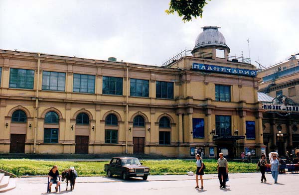 | Санкт-Петербургский планетарий расположен в Александровском парке, недалеко от станции метро "Горьковская". В отличие от Московского планетария, он работает, и здесь довольно оживленно, особенно порадовало большое количество школьников. В день проводится несколько показов и лекций на различные темы астрономического, географического и других направлений. В фойе развернута выставка минералов и окаменелостей, галерея астрофотографии. На втором этаже - экспозиция, состоящая из тематических блоков: "География", "Происхождение человека", "История развития взглядов на происхождение Земли и Вселенной", "Географические открытия", "Явления природы". В башне планетария установлен телескоп-рефрактор, на нем по определенному расписанию для всех желающих устраиваются сеансы наблюдений светил. |