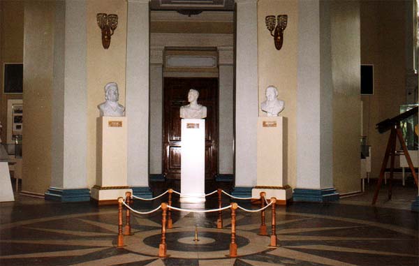 | И вот в сопровождении Сергея Васильевича мы поднимаемся по ступеням, ведущим к главному входу обсерватории. Снаружи идет ремонт, восстанавливаются меридианные павильоны, ведутся работы на куполе. Внутри нас встретила академическая тишина Круглого зала, уникальные экспонаты, портретная галерея выдающихся астрономов и ученых. Сразу, войдя в здание, мы увидели замечательный портрет пулковского астронома Н.А. Козырева, работы художника Л.А. Ткаченко. Этот ученый известен открытием так называемых "кратковременных явлений" на Луне, которые могут свидетельствовать о лунном вулканизме. Слева от входа - коллекция уникальных фотографий, полученных на крупнейшем менисковом телескопе системы Д.Д. Максутова - АЗТ-16 (астрономический зеркальный телескоп, диаметр мениска 70 см, диаметр зеркала 100 см), установленном в 1966 году в обсерватории Серро Эль Робле вблизи Сантьяго (Чили) для совместной работы с чилийскими астрономами по международной программе. |