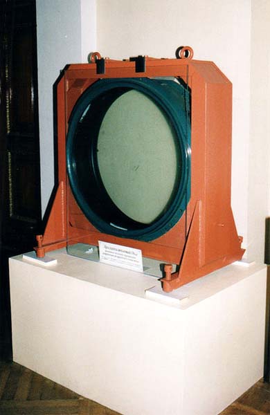 Интересна история этого объектива. Его рассчитал и собственноручно изготовил Д.Д.Максутов, но уже в процессе работы над ним, рассуждая о преимуществах менисковых телескопов, даже в такой области, как астрометрия, он предсказывал этому объективу участь музейного экспоната, считая нецелесообразным строительство нового гигантского рефрактора. Об этом наш замечательный ученый пишет в своей известной монографии "Изготовление астрономической оптики и ее контроль". Так оно и случилось. Во вновь отстроенной башне большого рефрактора был установлен 65-см телескоп, полученный по репарации из Германии, а 820-мм объектив занял почетное место в музее..