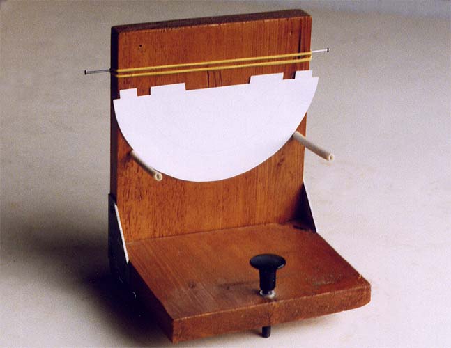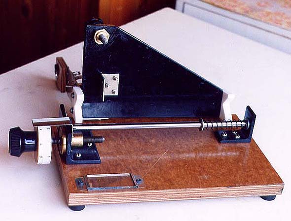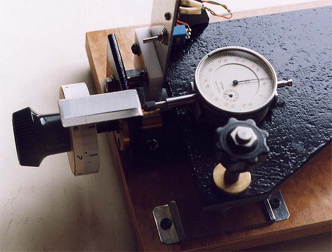 Кроме того, чтобы проверить точность измерения перемещений при помощи лимба, я применил для той же цели дисковый индикатор. Это оказалось излишним. Лимб, т.е. барабан, установленный на оси винта продольных перемещений, позволяет с достаточной точностью, по крайней мере с погрешностью не хуже 0,05 мм отмечать положение головки прибора. Нужно заметить только, что винт должен иметь резьбу с шагом 1 мм, тогда один поворот винта будет соответствовать продольному перемещению на 1 мм. Окружность барабана можно легко разметить, наклеив полоску миллиметровой бумаги.