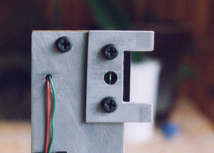 Отличие моего прибора от конструкции, описанной в книге Ж.Тексеро заключается, в основном, в применении подвижного источника освещения. Это позволяет уменьшить расстояние между "звездой" (или щелью) и "ножом" (или нитью). В качестве источника света я применил зеленый светодиод. Комбинация его с различными насадками позволила применять различные методы испытания: "звезда" и "нож", щель и "нож", щель и нить.