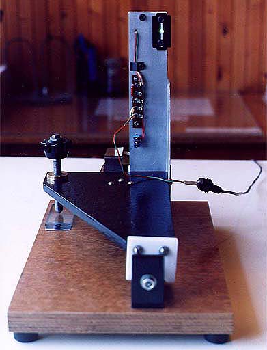 Устройство подвижной части прибора основано на том, что положение плоскости определяется тремя точками. Этими точками являются две подвижные опоры, скользящие по металлическому стержню и опорный винт, служащий одновременно для перемещения головки прибора в направлении, перпендикулярном оптической оси зеркала. Опирается винт на полоску зеркального стекла, толщиной 4...6 мм. Подвижные опоры представляют собой пластины из бронзы или (как в моем случае) фторопласта с угловыми вырезами и являются своеобразными саморегулирующимися подшипниками скольжения, которые двигаются по направляющему стальному стержню. Такой стержень несложно подобрать из деталей старой, нерабочей оргтехники. Можно выточить его на станке, поверхность желательно отполировать.