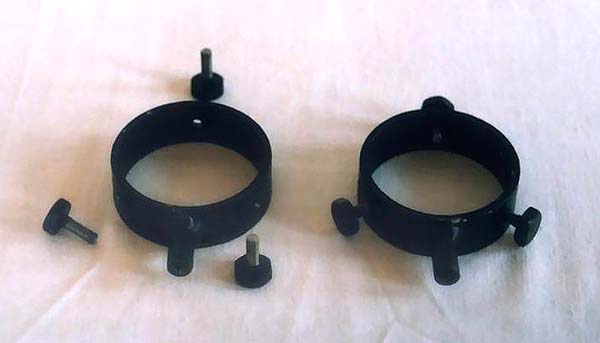 Устройство крепления состоит из двух металлических колец с тремя юстировочными винтами на каждом. К кольцам приварены ножки. Они соединяются с трубой с помощью болтов.